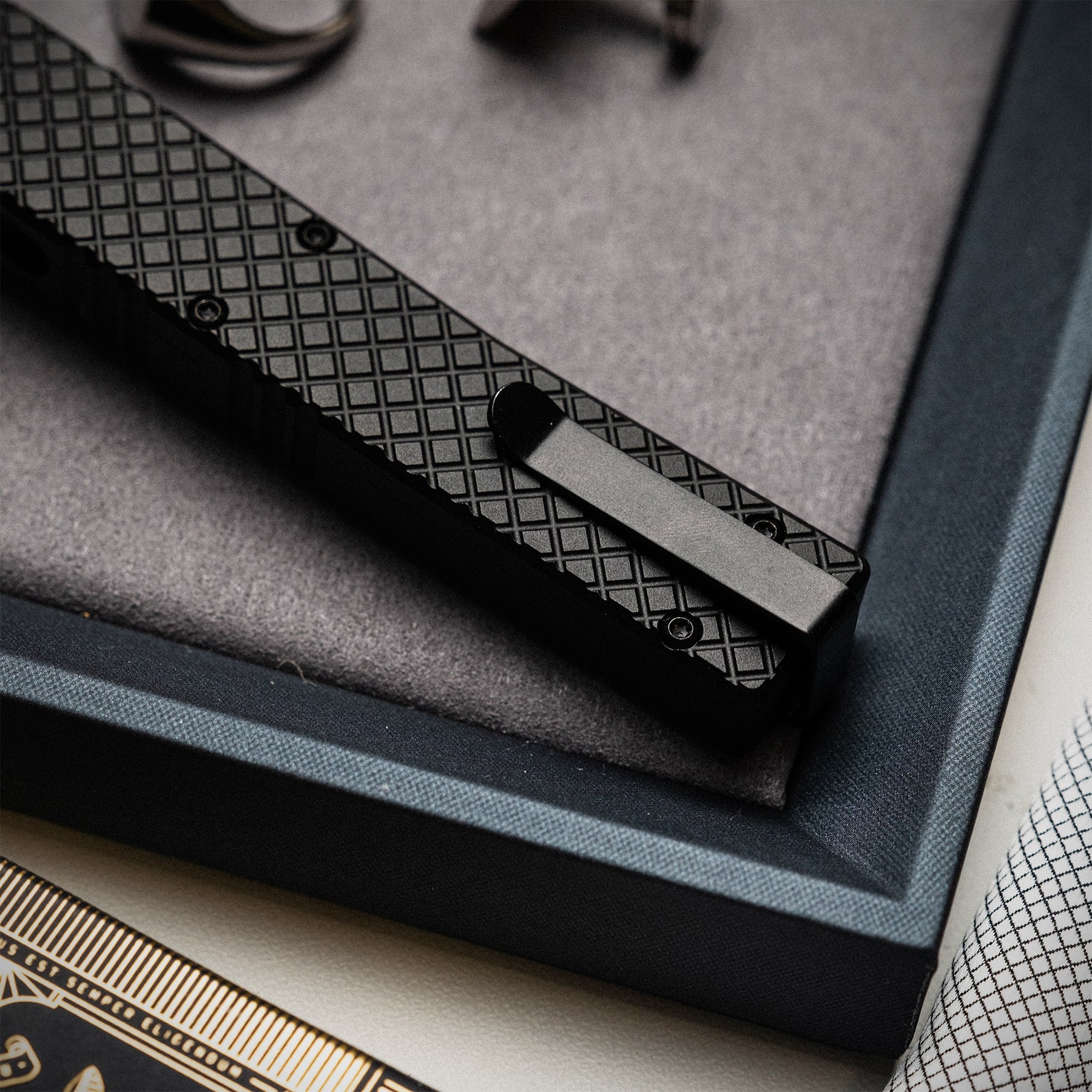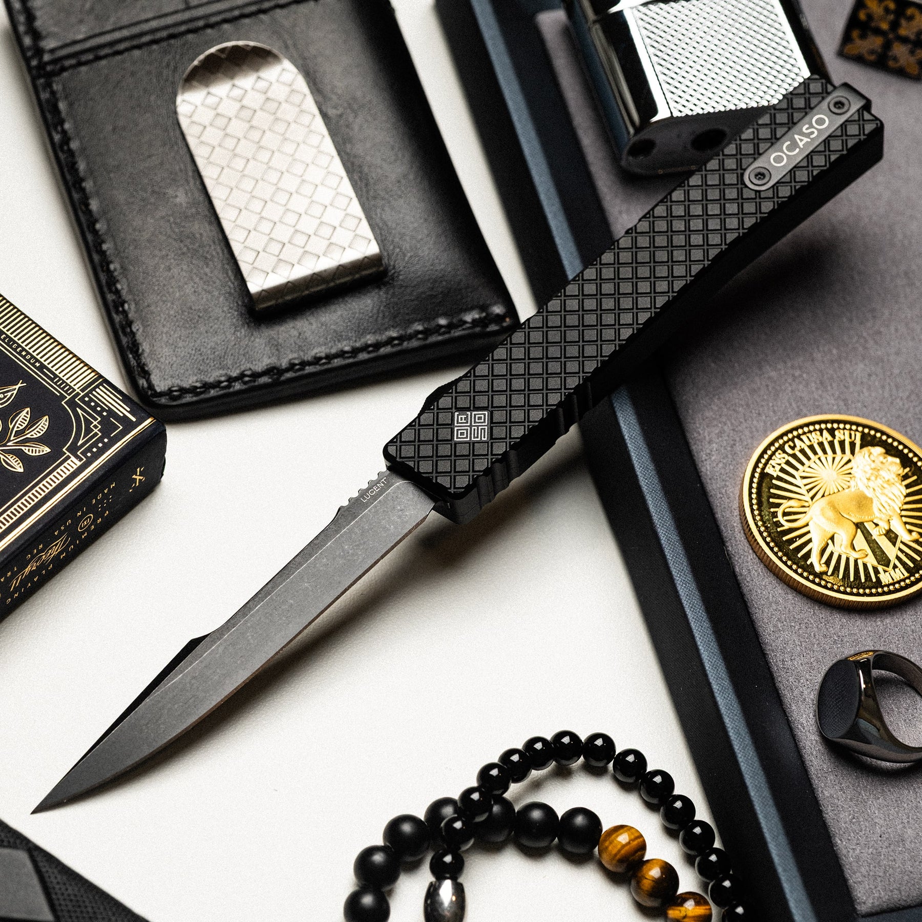 The Lucent is an everyday carry automatic knife that is both elegant and effective. Designed by Andrew Demko, this dual-action, out-the-front automatic delivers fast, effortless blade deployment in a lightweight, stylish package. The slim and compact 6061-T6 aluminum handle features an elegant cross-hatch pattern that offers both a secure grip and style. Jimping on the top and underside of the handle ensure a firm hold during blade release and retraction. Crafted from high-performance Böhler M390 steel for exceptional edge retention and corrosion resistance. For ultra-compact carry, the Mini model features a California-legal 1.9" blade and weighs just 1.5 ounces, while the Large boasts a striking 3.5" harpoon-style blade.