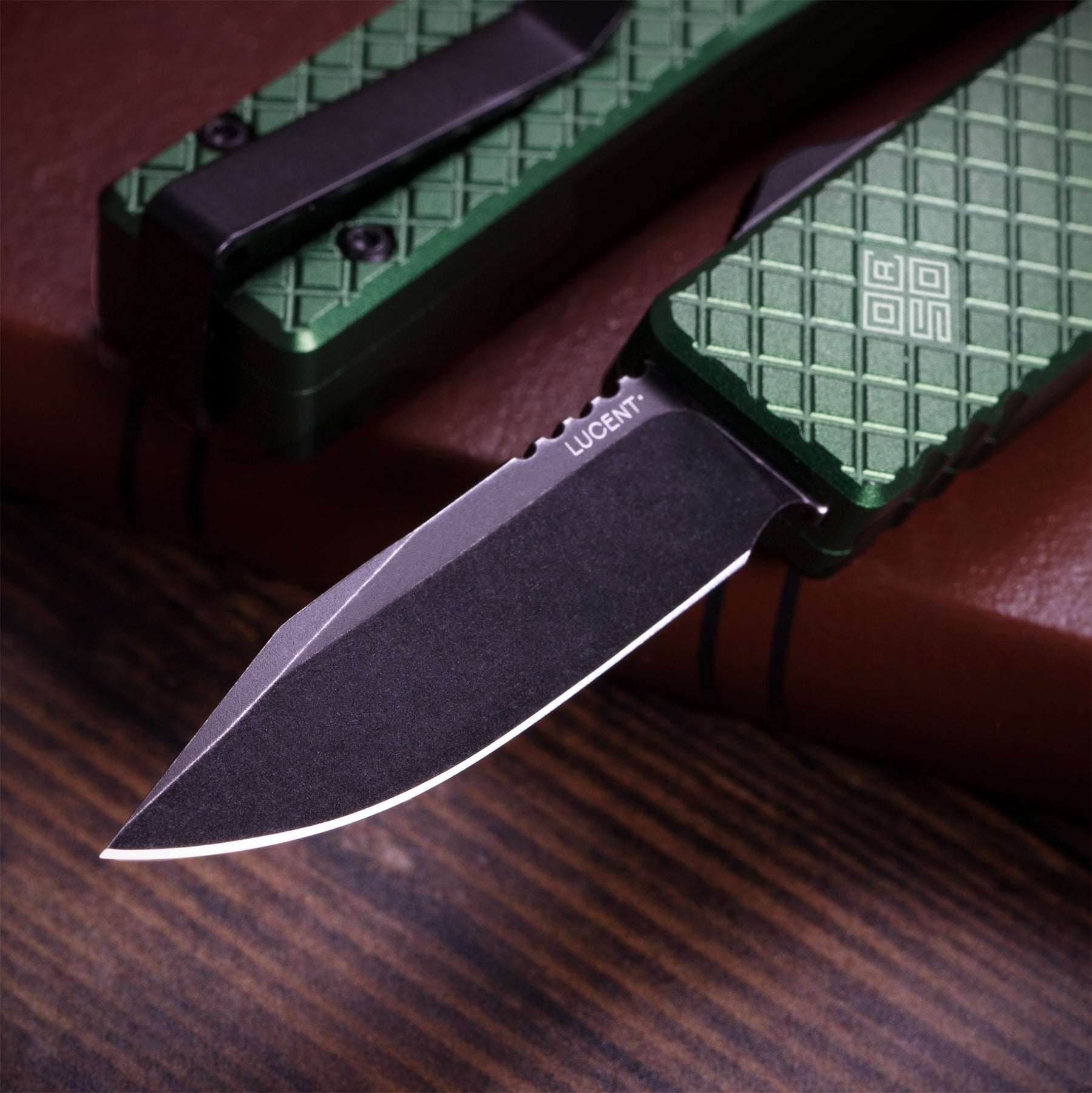Coming Early December The Lucent is an everyday carry automatic knife that is both elegant and effective. Designed by Andrew Demko, this dual-action, out-the-front automatic delivers fast, effortless blade deployment in a lightweight, stylish package. The slim and compact 6061-T6 aluminum handle features an elegant cross-hatch pattern that offers both a secure grip and style. Jimping on the top and underside of the handle ensure a firm hold during blade release and retraction. Crafted from high-performance Böhler M390 steel for exceptional edge retention and corrosion resistance. For ultra-compact carry, the Mini model features a California-legal 1.9" blade and weighs just 1.5 ounces, while the Large boasts a striking 3.5" harpoon-style blade. Bold forest green paired with a black blade and hardware give the Lucent a striking look. It's a classic tone that enhances the sleek design, making it a standout for everyday carry.