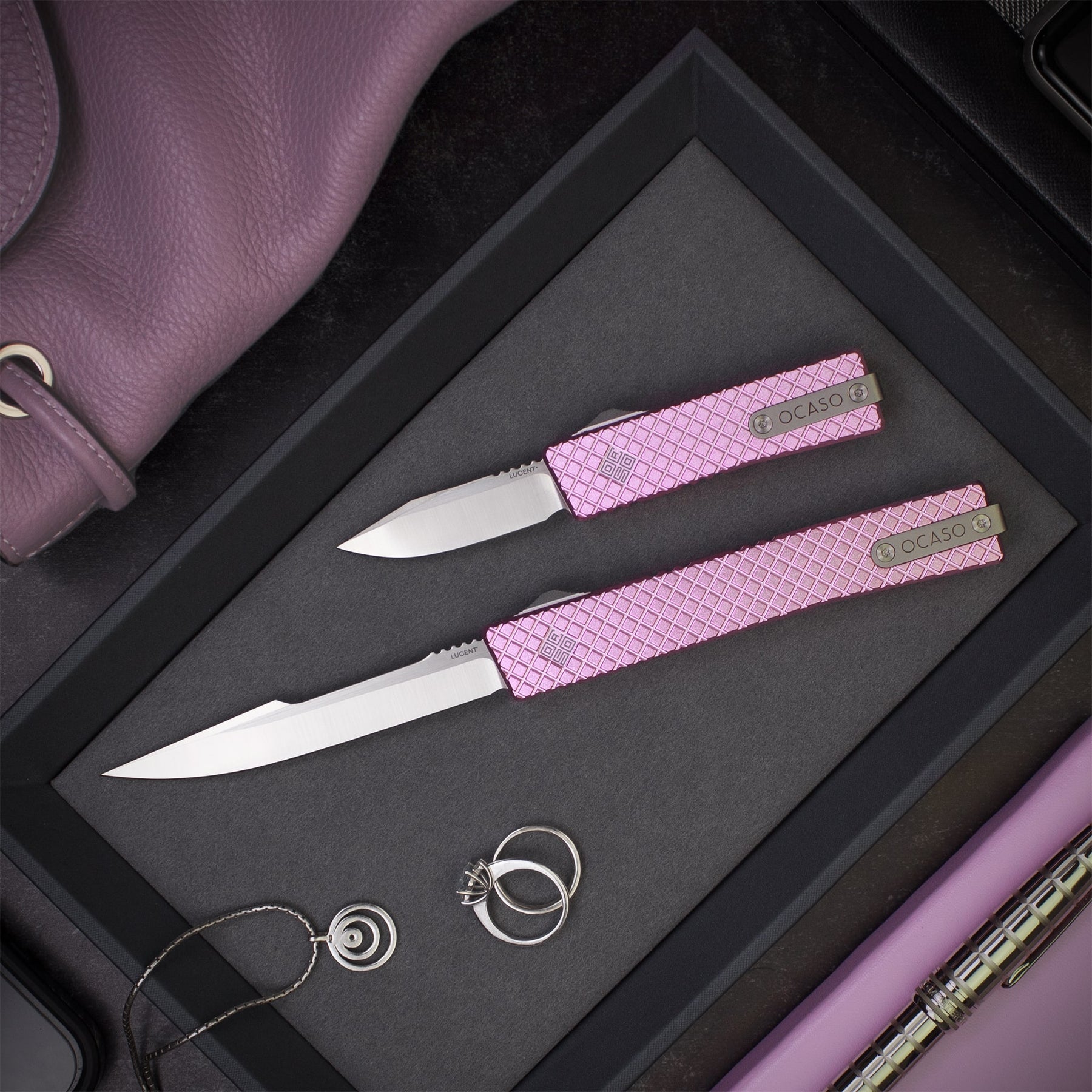 Coming Early December The Lucent is an everyday carry automatic knife that is both elegant and effective. Designed by Andrew Demko, this dual-action, out-the-front automatic delivers fast, effortless blade deployment in a lightweight, stylish package. The slim and compact 6061-T6 aluminum handle features an elegant cross-hatch pattern that offers both a secure grip and style. Jimping on the top and underside of the handle ensure a firm hold during blade release and retraction. Crafted from high-performance Böhler M390 steel for exceptional edge retention and corrosion resistance. For ultra-compact carry, the Mini model features a California-legal 1.9" blade and weighs just 1.5 ounces, while the Large boasts a striking 3.5" harpoon-style blade. We've anodized the aluminum handle in a classy blush pink that pairs beautifully with the satin-finished blade and hardware, giving it a sophisticated splash of color that feels elegant and timeless.