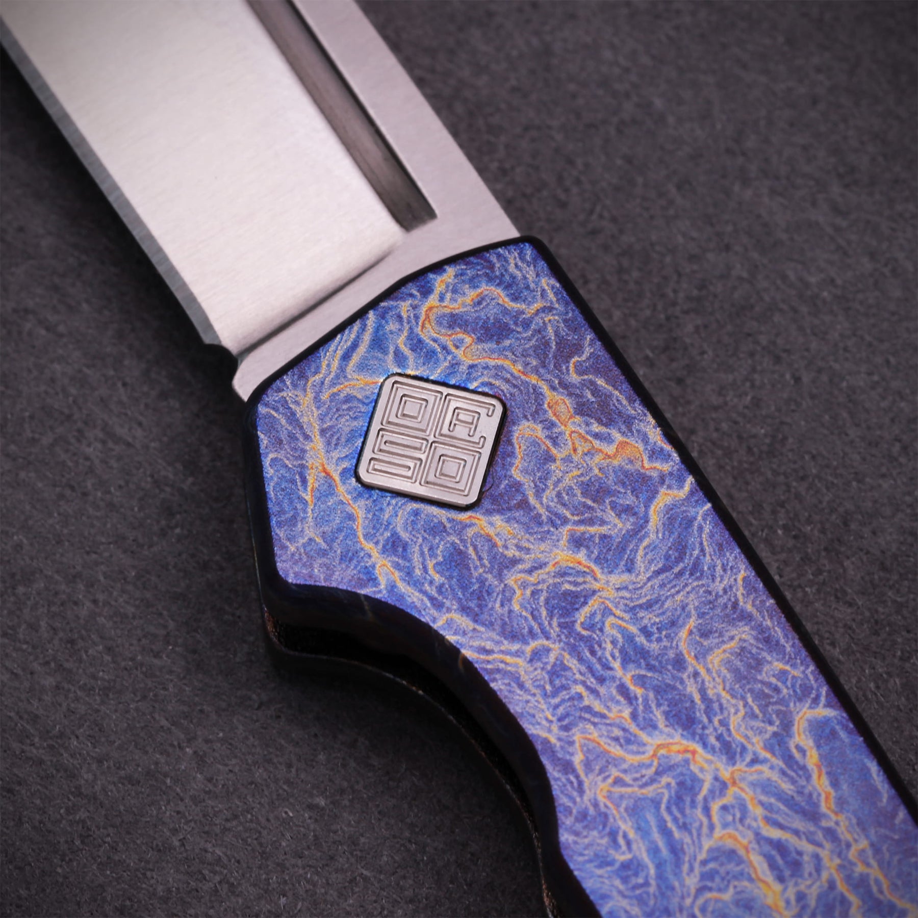 The Sovranto is available with an "entropic" anodized finish, showcasing complex, random patterns and a striking coloration. The anodization process results in unique patterns and a range of color hues from blue to deep purple. The pattern and color on each knife varies due to the nature of the process.