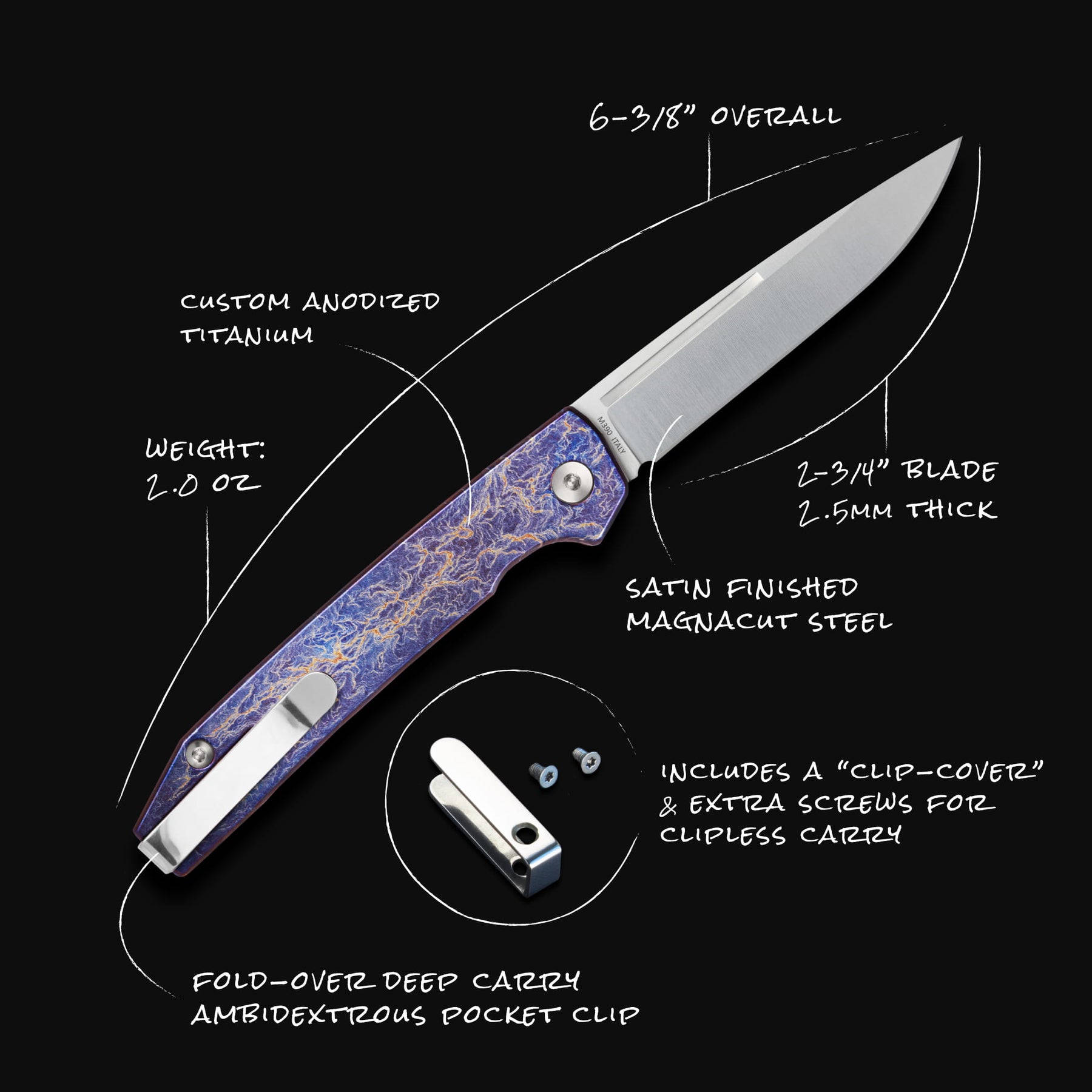 Made in Maniago, Italy and featuring a 2.75" MagnaCut steel blade, a compact Titanium handle, and smooth "walk and talk" function with a solid half-stop and satisfying, secure close. The signature fold-over ambidextrous pocket clip can be replaced with an included "clip-cover" for those times when you want to carry this knife clipless and as compact as possible.
