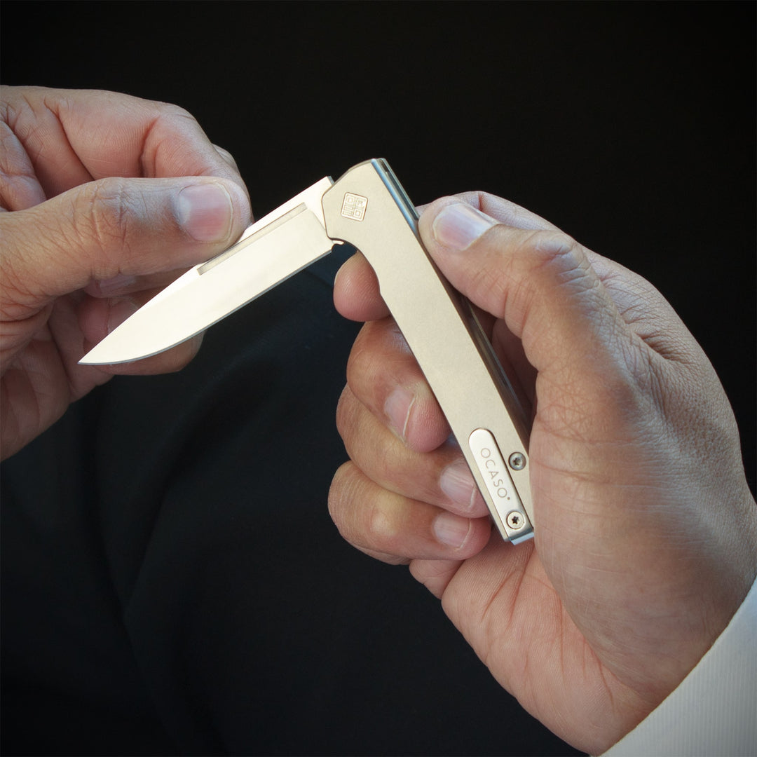The Sovranto delivers ideal "walk and talk" functionality, featuring a seamless glide, a solid half-stop, and a satisfying, secure closure, all hallmarks of a well-crafted slipjoint knife. "Walk" describes the smooth movement of the tang along the spring as the blade opens, while "Talk" refers to the crisp, audible snap when it closes.