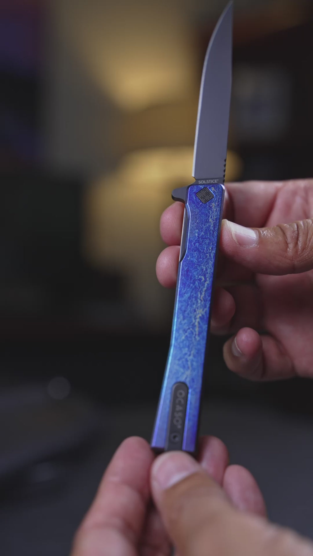 Our Titanium Solstice is available in a unique anodized finish that takes this already incredible knife to another level. Custom finished in small quantities using an "entropic" anodizing style, the complex, random patterns and striking coloration evoke the look of lightning or nebulas. Each knife is a unique work of art, ideal for collectors or anyone who wants something truly special for their everyday carry.
